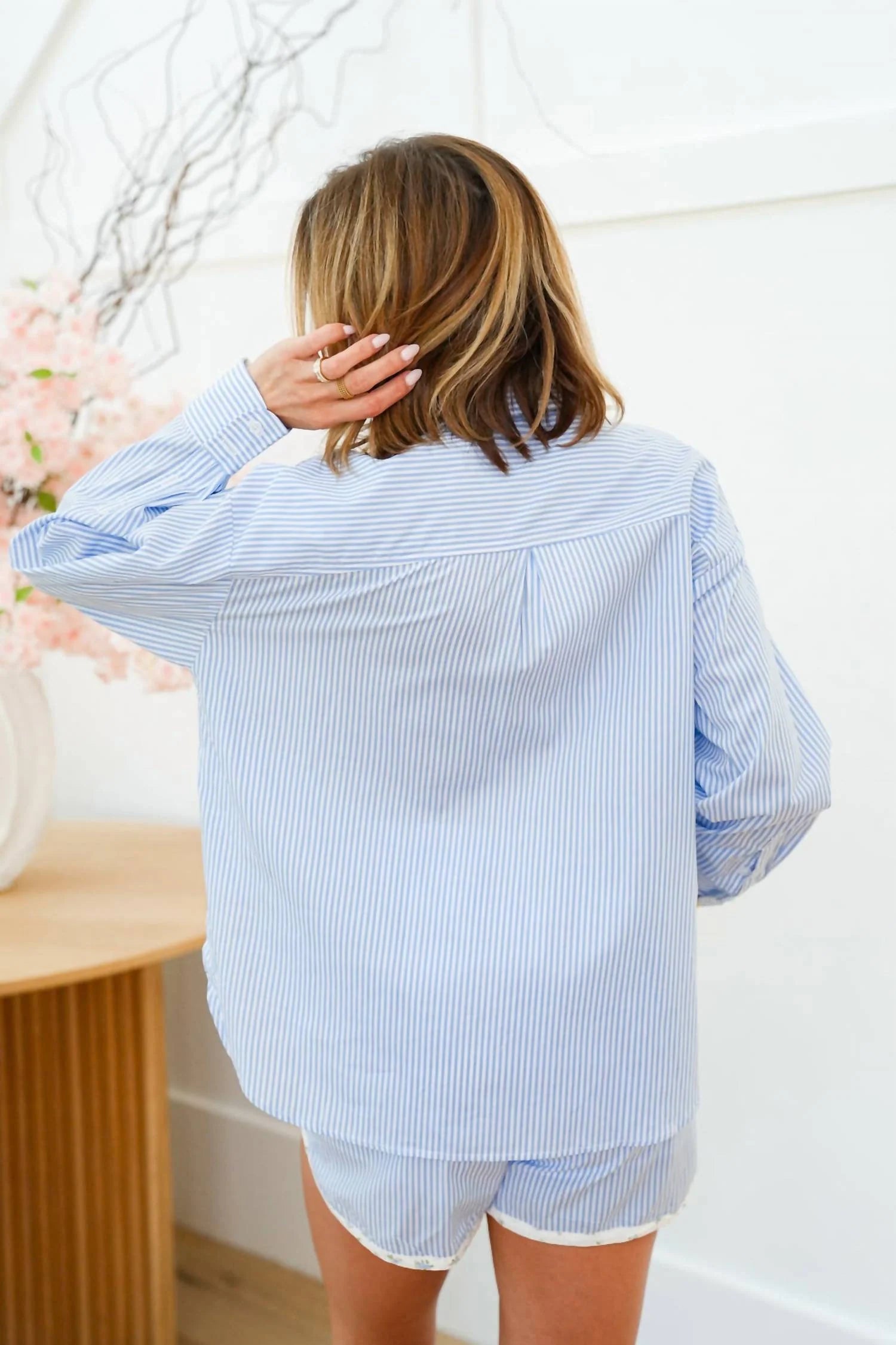 A match made in heaven. This two-piece set is so cute, you'll wish you could wear it out of the house! Did we mention how comfortable it is, too? You may want two sets! The Ditsy Floral Short Set is an ideal choice for any time of year, blending comfort and style seamlessly. This loungewear set features a charming striped pattern and long sleeves, highlighted by a classic collar for a relaxed yet chic look. Made from soft and breathable cotton, it keeps you comfortable in warm weather.