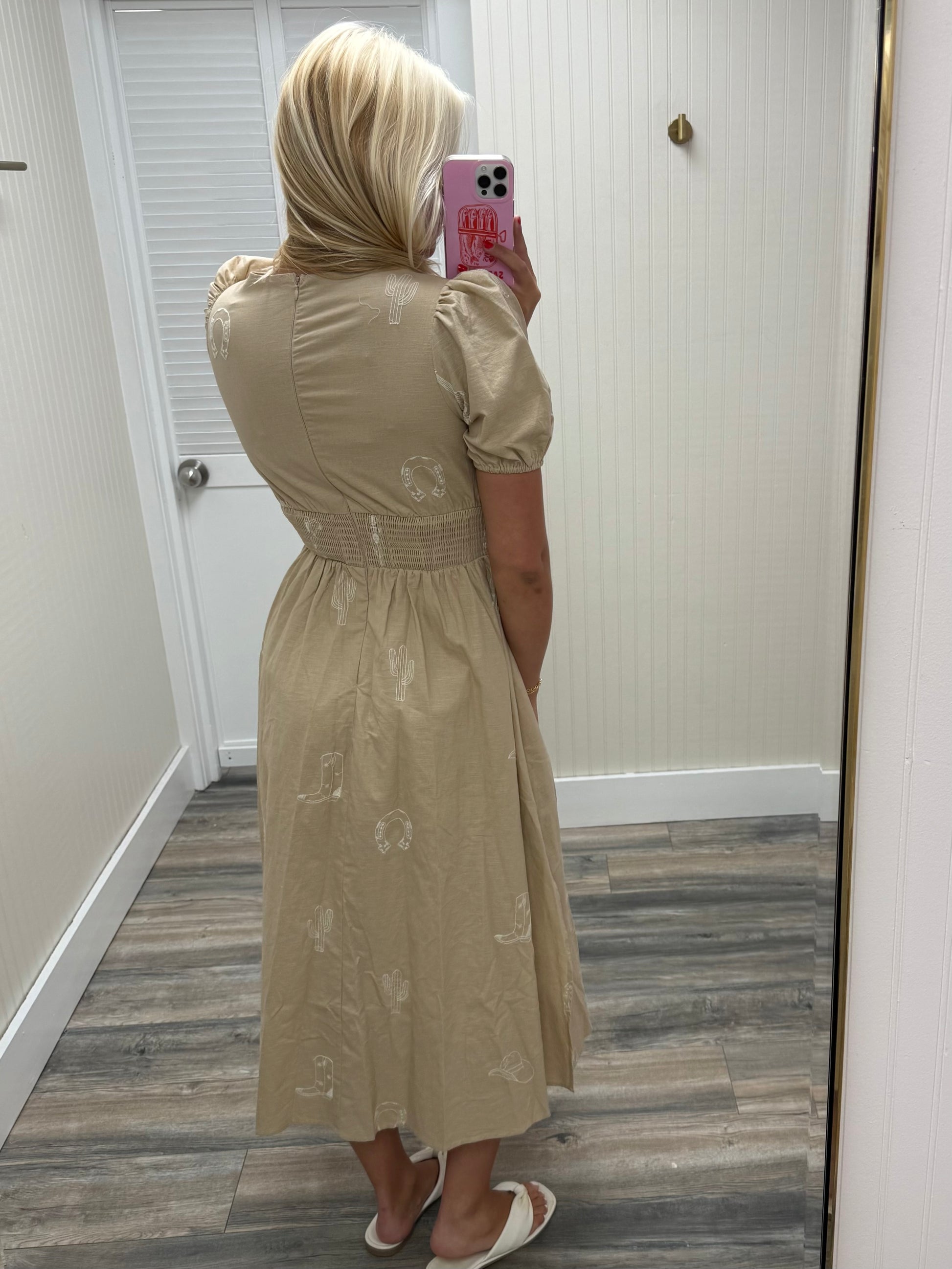 This Western Embroidered Puff Sleeve Midi Dress combines a playful silhouette with detailed embroidery for a stylish, casual look. Its puff sleeves add a trendy touch while the midi length offers comfortable coverage, perfect for day-to-night wear.